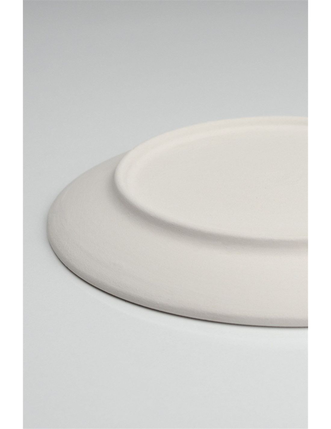Assiette réalisée en faïence blanche à l'état de biscuit. Après séchage, elle est cuite à 1050°C et devient un biscuit. Grâce à sa surface poreuse, elle est prête à être peinte avec des couleurs à peindre, des émaux ou encore des peintures acryliques (pour un usage décoratif).
