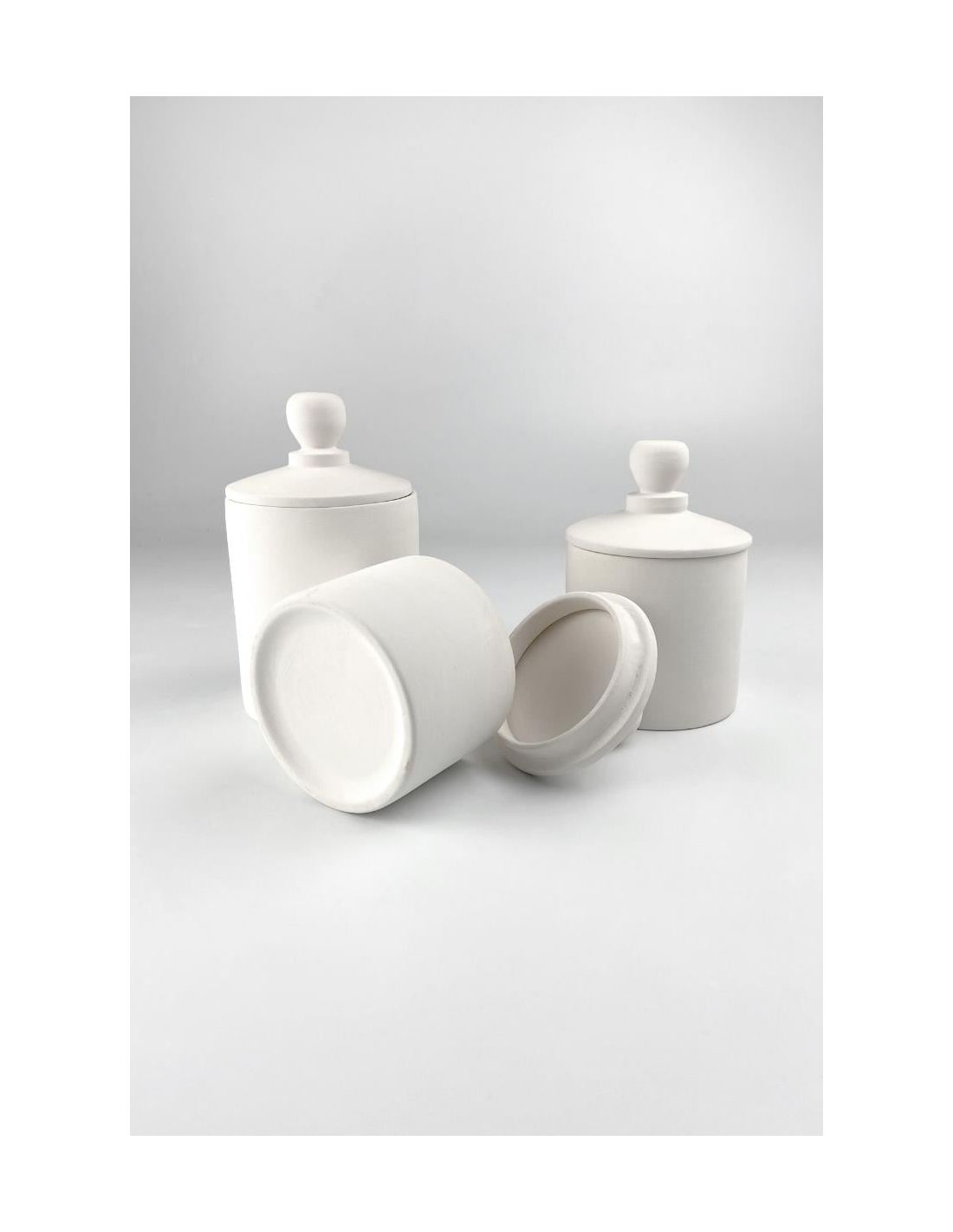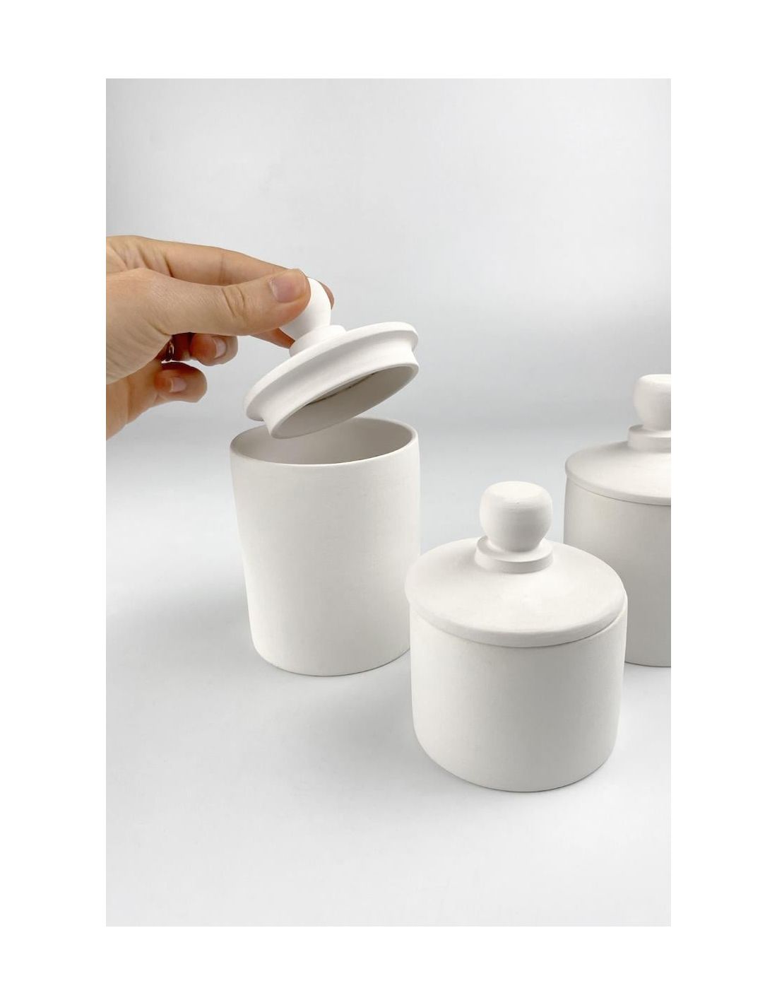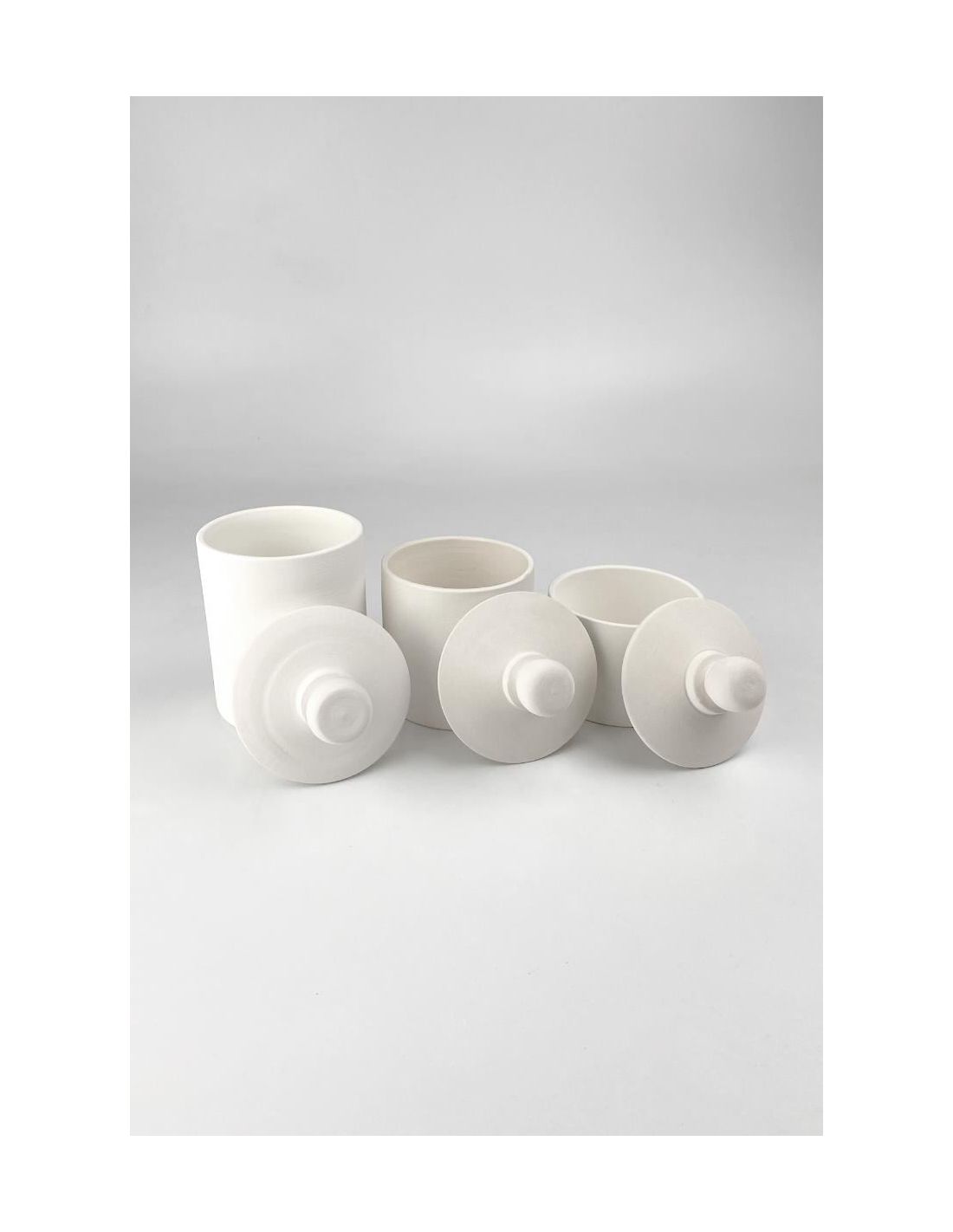 Lot de trois pots à épices réalisé en faïence blanche à l'état de biscuit. Après séchage, il est cuit à 1050°C et devient un biscuit. Grâce à sa surface poreuse, il est prêt à être peint avec des couleurs à peindre, des émaux ou encore des peintures acryliques (pour un usage décoratif).