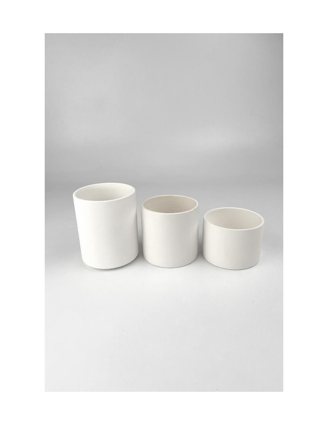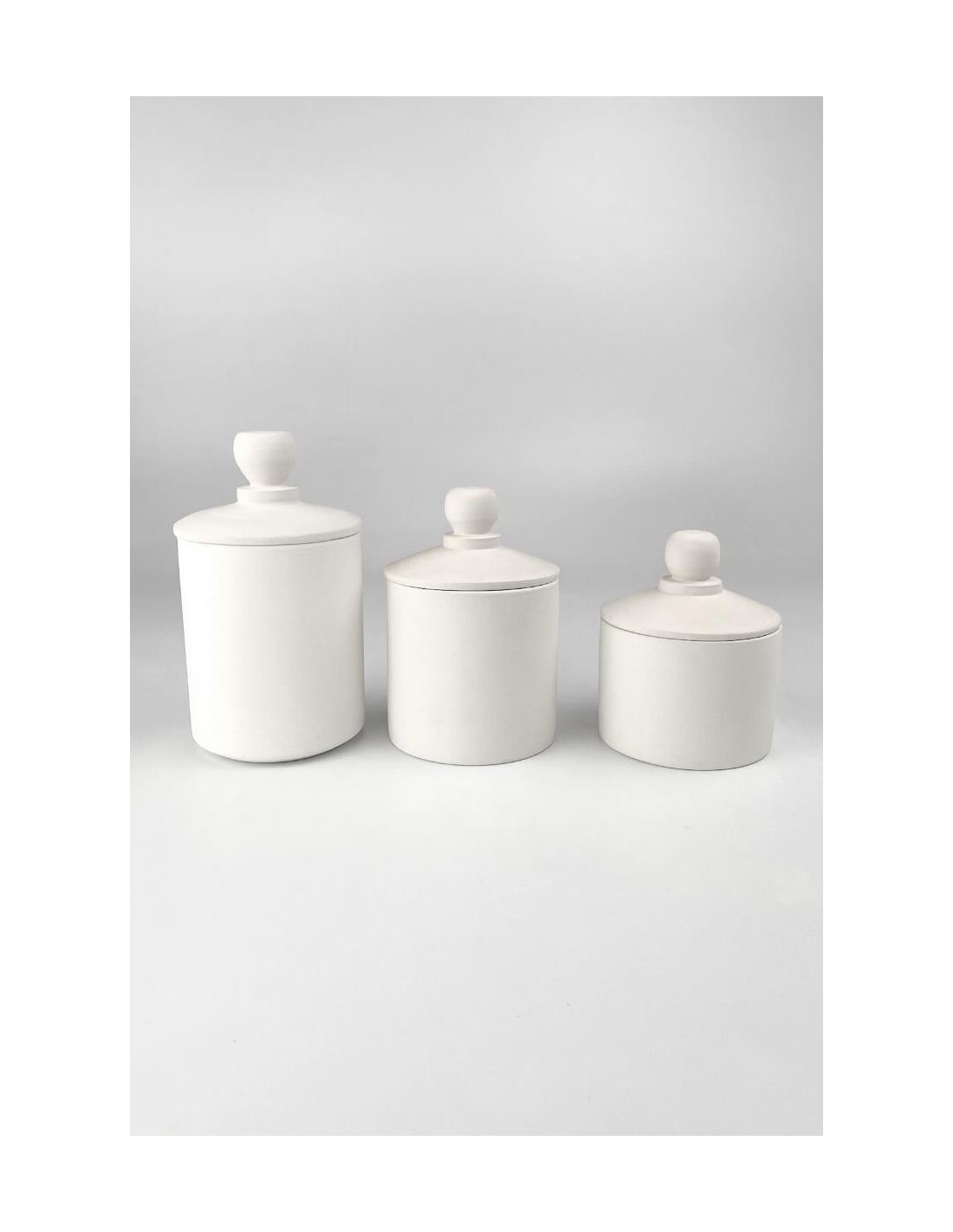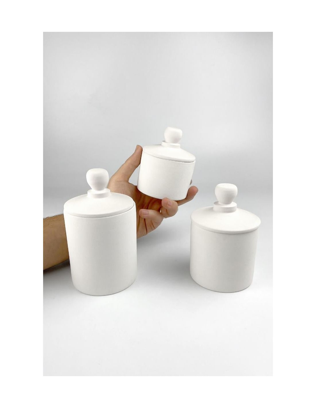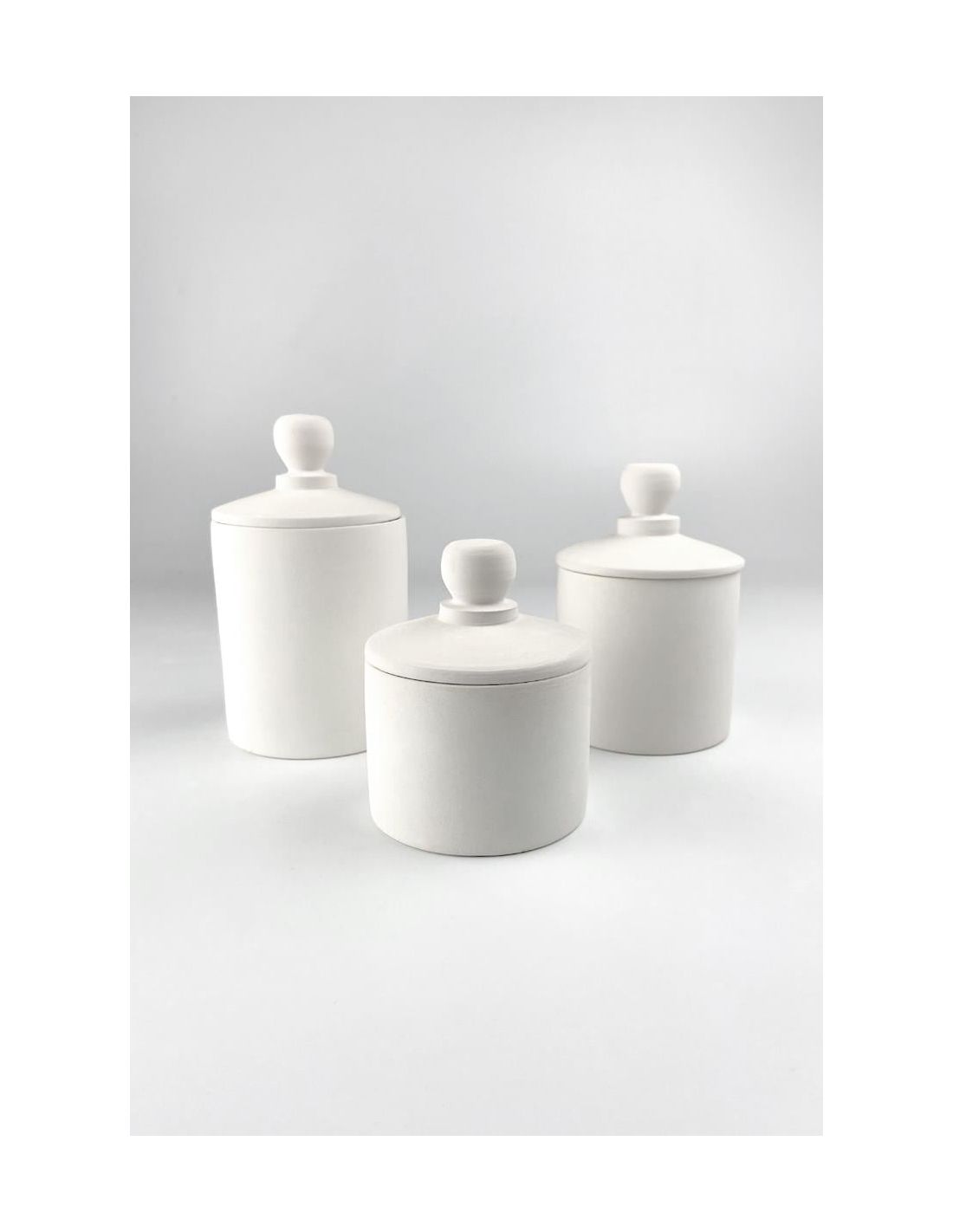 Lot de trois pots à épices réalisé en faïence blanche à l'état de biscuit. Après séchage, il est cuit à 1050°C et devient un biscuit. Grâce à sa surface poreuse, il est prêt à être peint avec des couleurs à peindre, des émaux ou encore des peintures acryliques (pour un usage décoratif).
