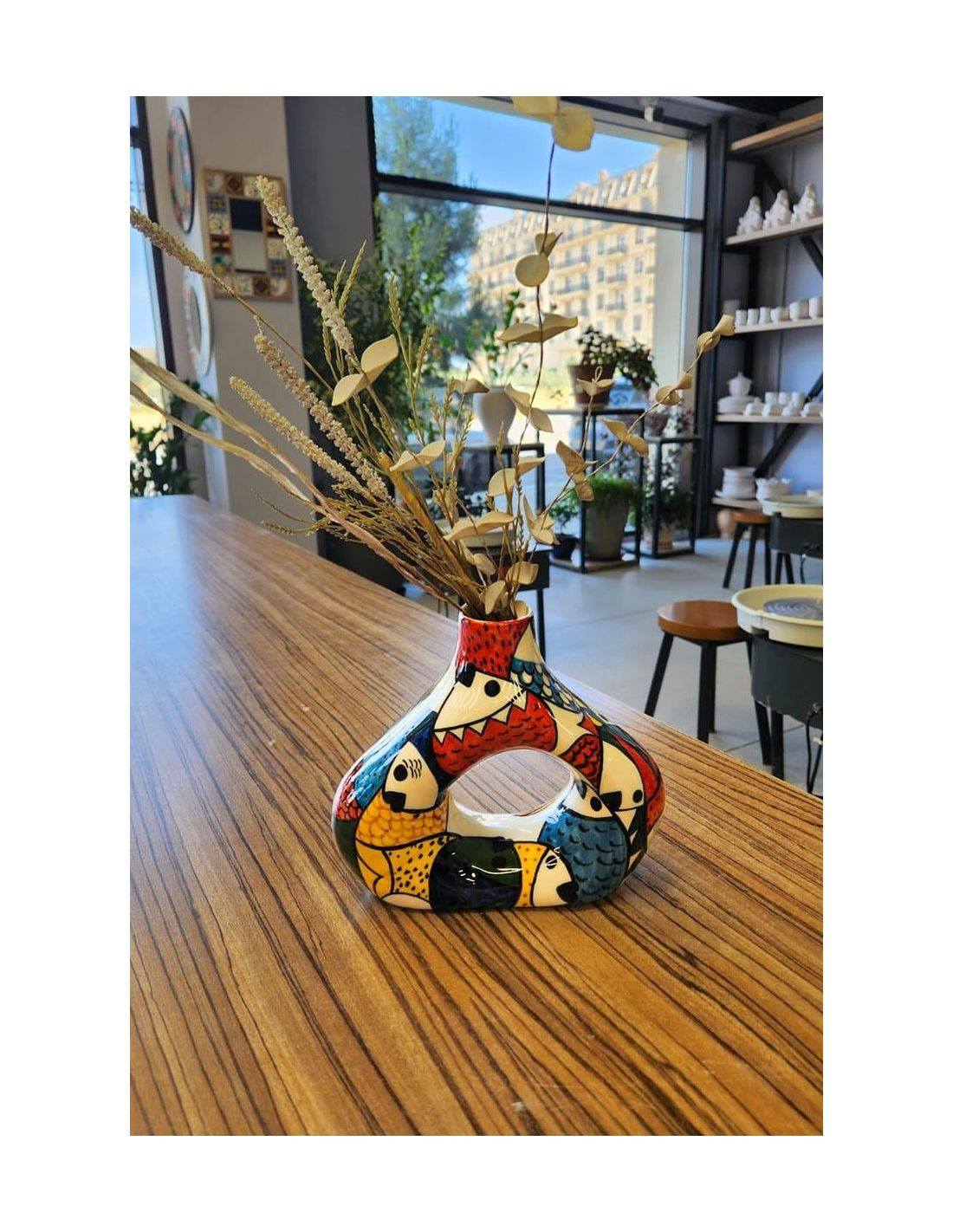 Vase réalisé en faïence blanche à l'état de biscuit. Après séchage, il est cuit à 1050°C et devient un biscuit. Grâce à sa surface poreuse, il est prêt à être peint avec des couleurs à peindre, des émaux ou encore des peintures acryliques (pour un usage décoratif).