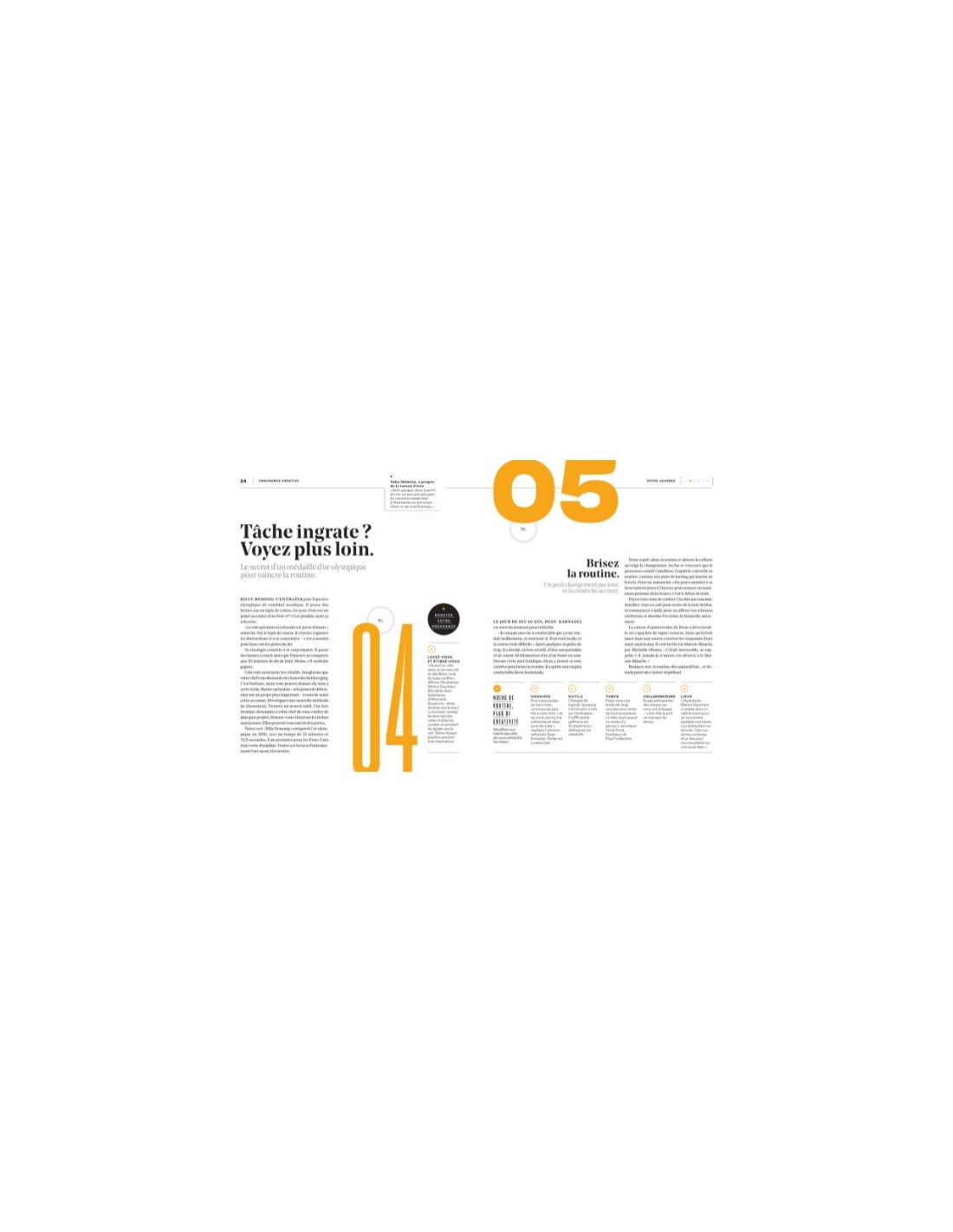 En partant de son expérience personnelle et des témoignages de nombreux athlètes de haut niveau et de leaders créatifs, Mike Schnaidt offre des conseils simples et pratiques pour stimuler les créatifs et toutes les personnes en panne d’inspiration. Il invite chacun à s’interroger sur le sens de son travail et à réagir positivement à l’adversité. Cet ouvrage transmet ainsi une énergie rare et une volonté de gravir des sommets pour atteindre ses objectifs.