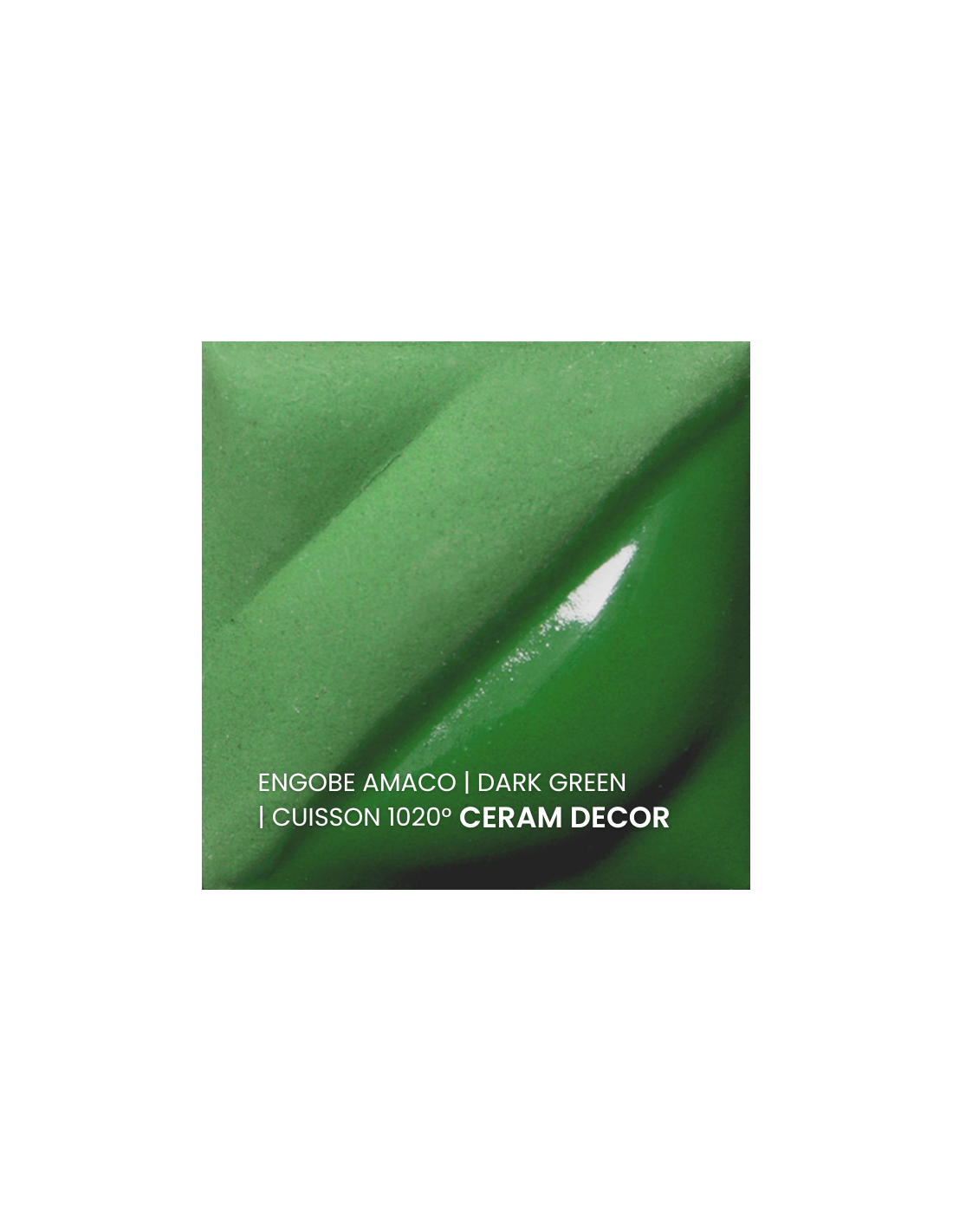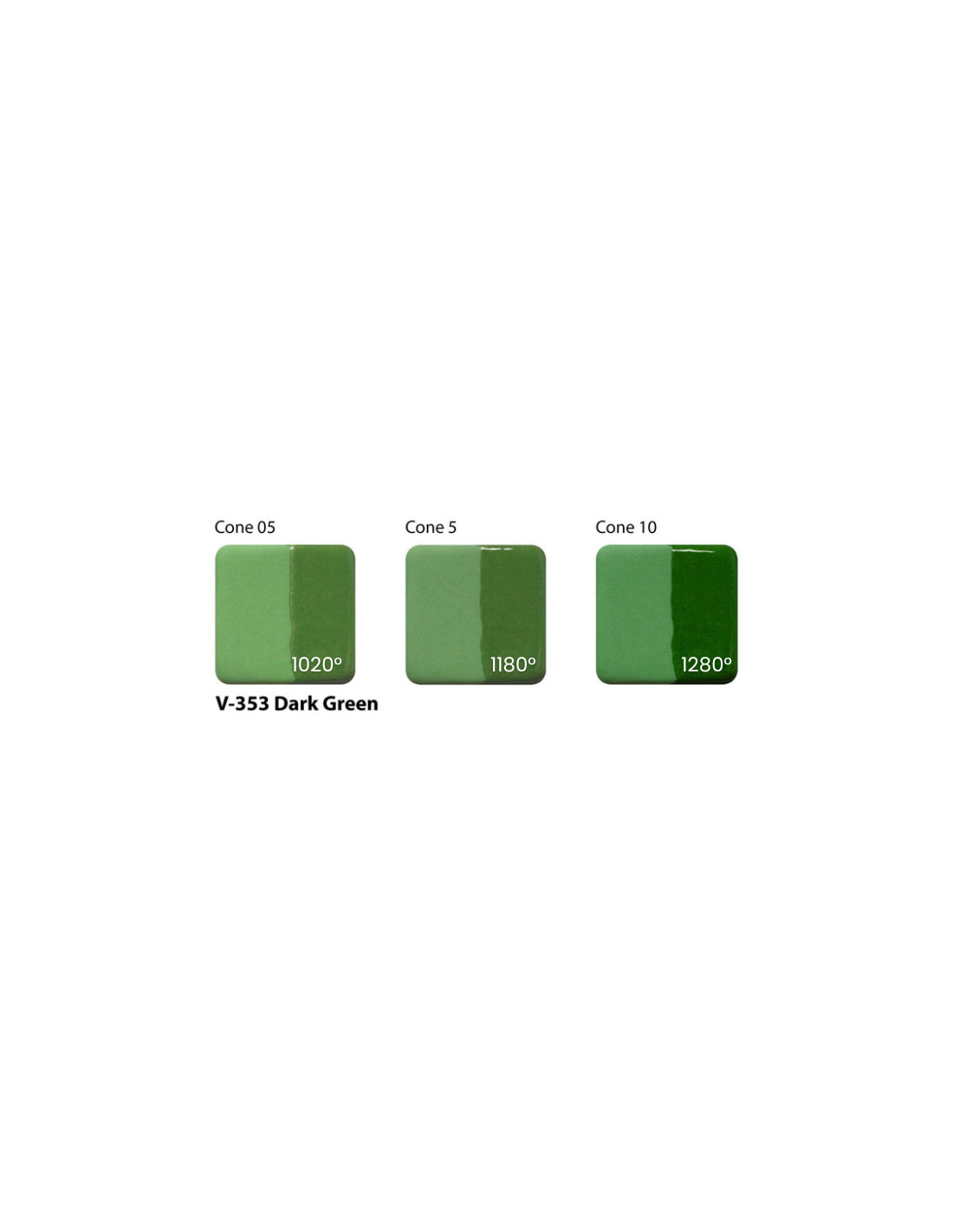 V-353 Dark green :Vert riche brillant et saturé à 1050°C qui s'assombrit en vert forêt à 1180°C et devient légèrement plus foncé à 1280°C.