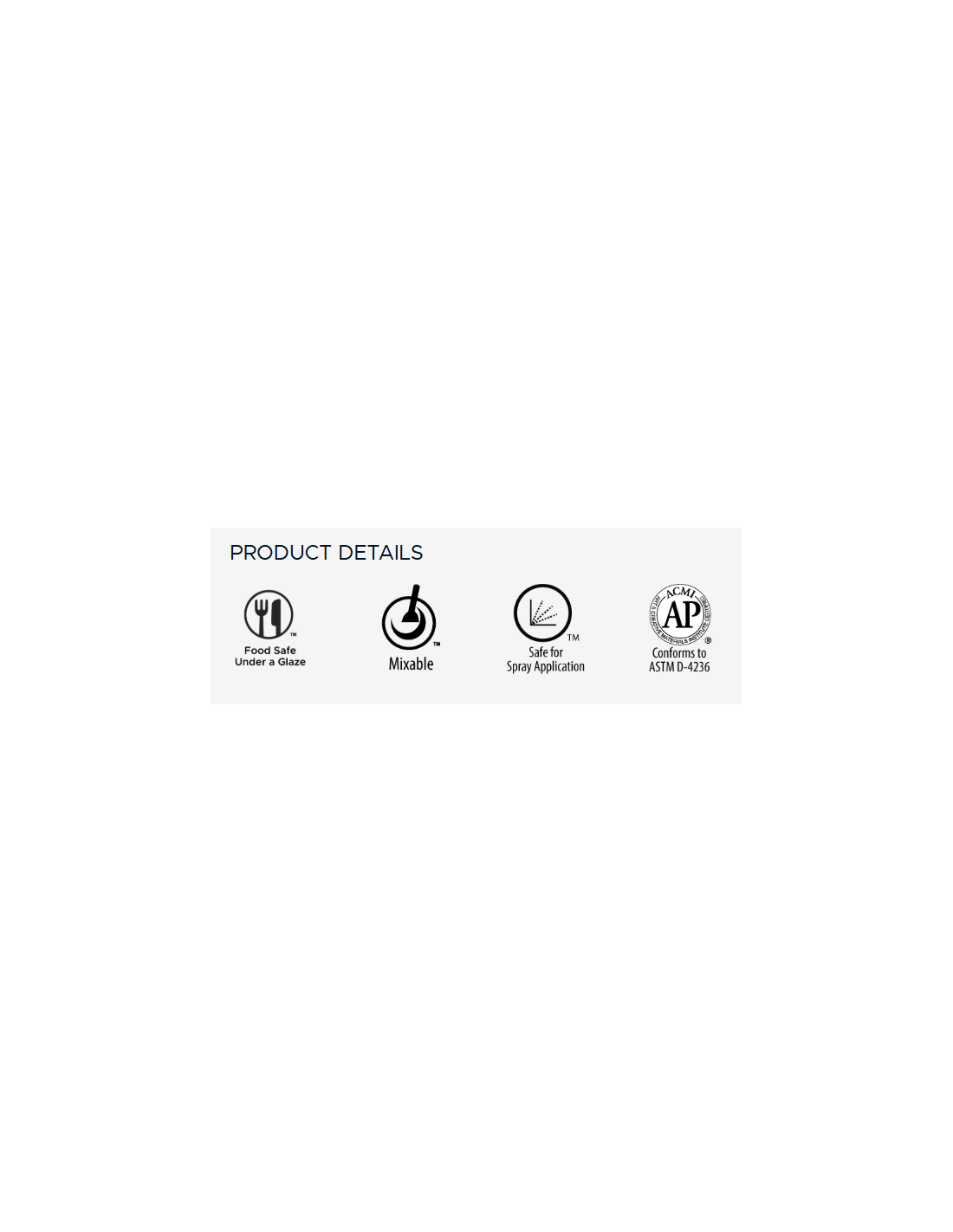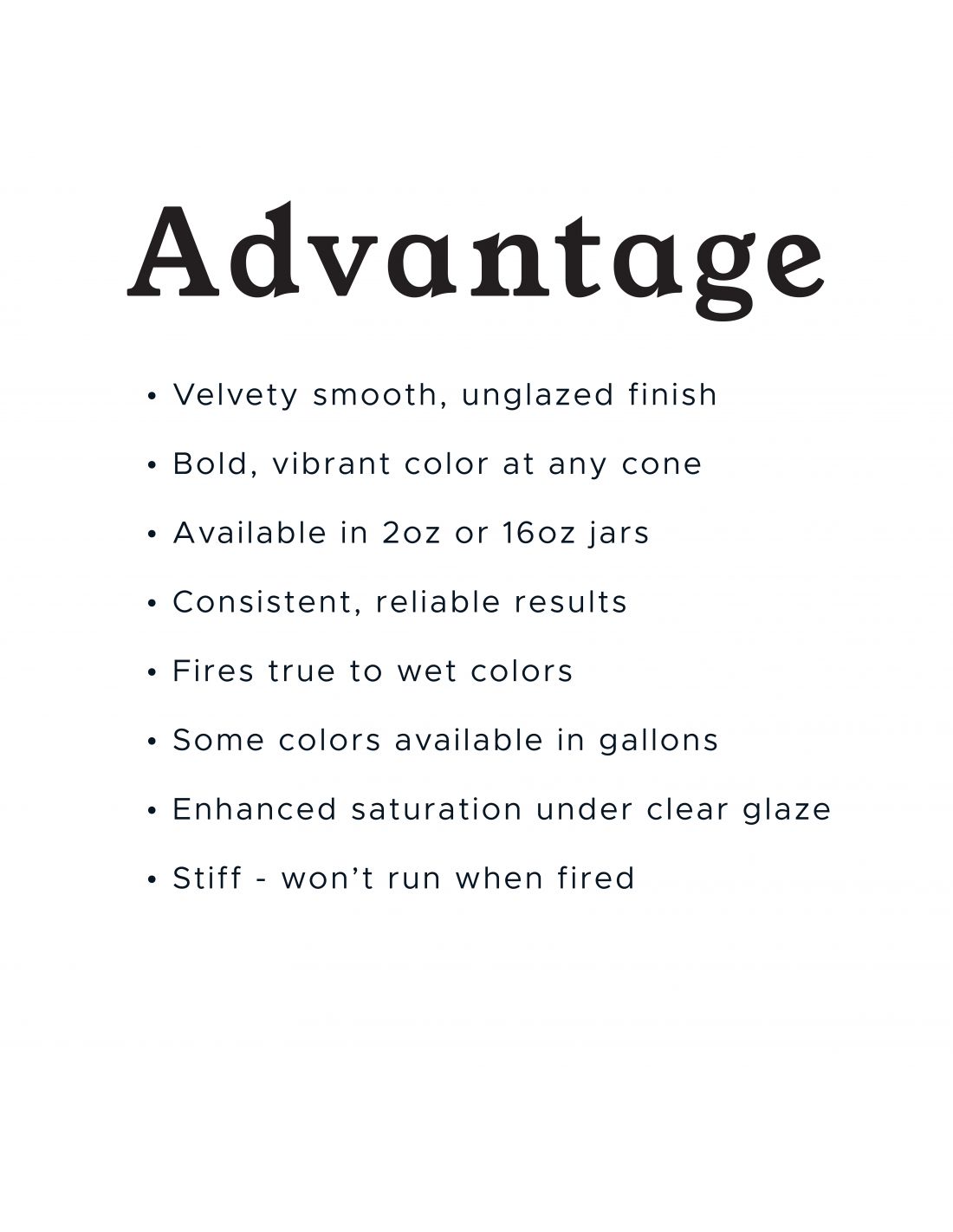 Grâce à sa haute concentration en pigments, elle convient aussi bien aux décors fins qu'aux applications couvrantes, similaires à celles d'un engobe, en appliquant plusieurs couches.