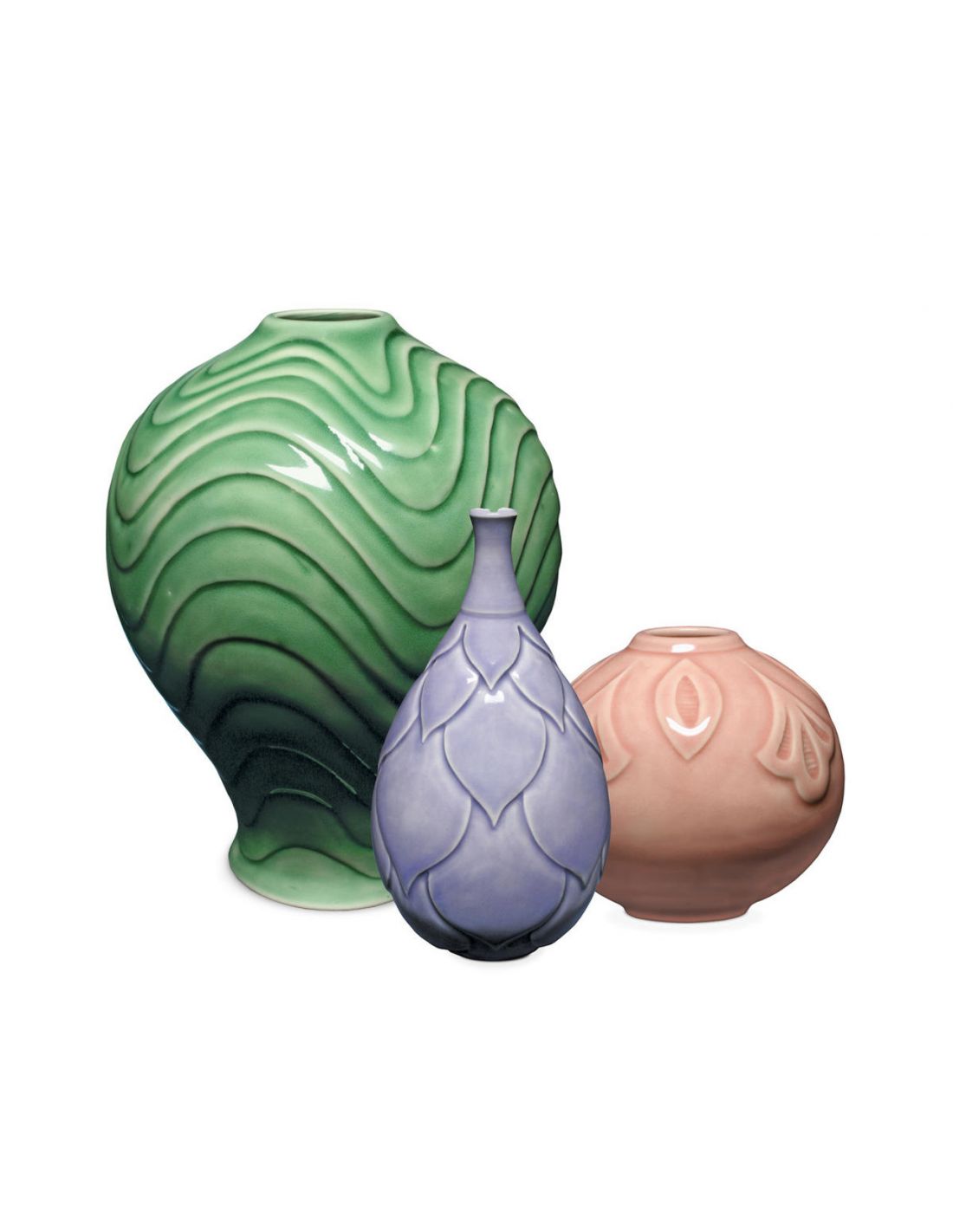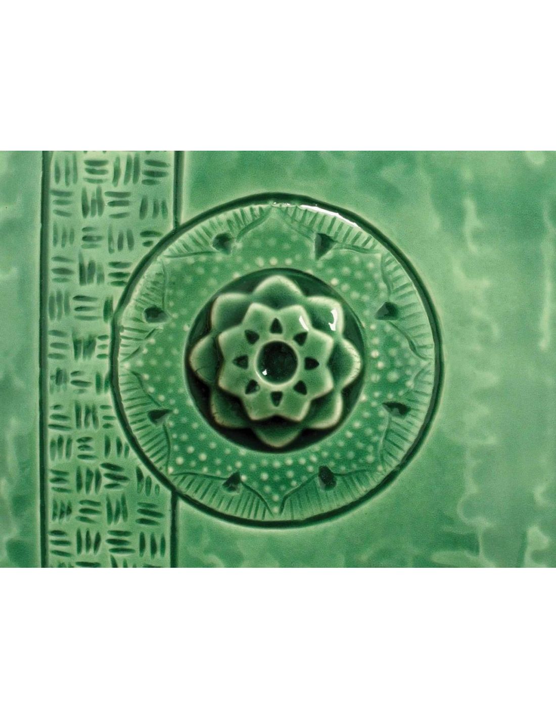 La gamme Céladon d'Amaco se compose d'émaux translucides brillants, conçus pour mettre en valeur les reliefs, textures et décors gravés des pièces céramiques. Leur transparence permet aux détails de rester visibles tout en apportant une profondeur subtile à la surface.