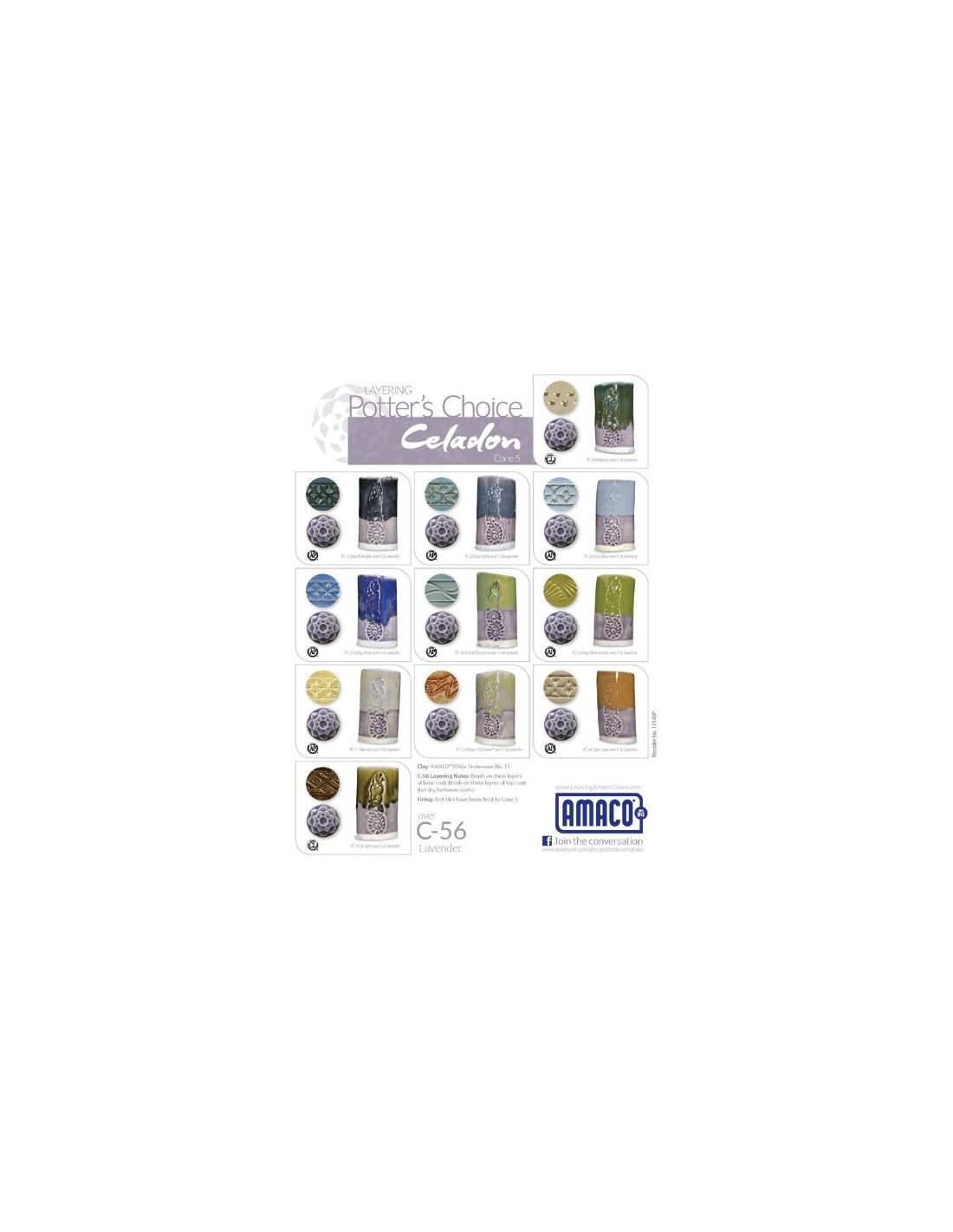 La gamme Céladon d'Amaco se compose d'émaux translucides brillants, conçus pour mettre en valeur les reliefs, textures et décors gravés des pièces céramiques. Leur transparence permet aux détails de rester visibles tout en apportant une profondeur subtile à la surface.
