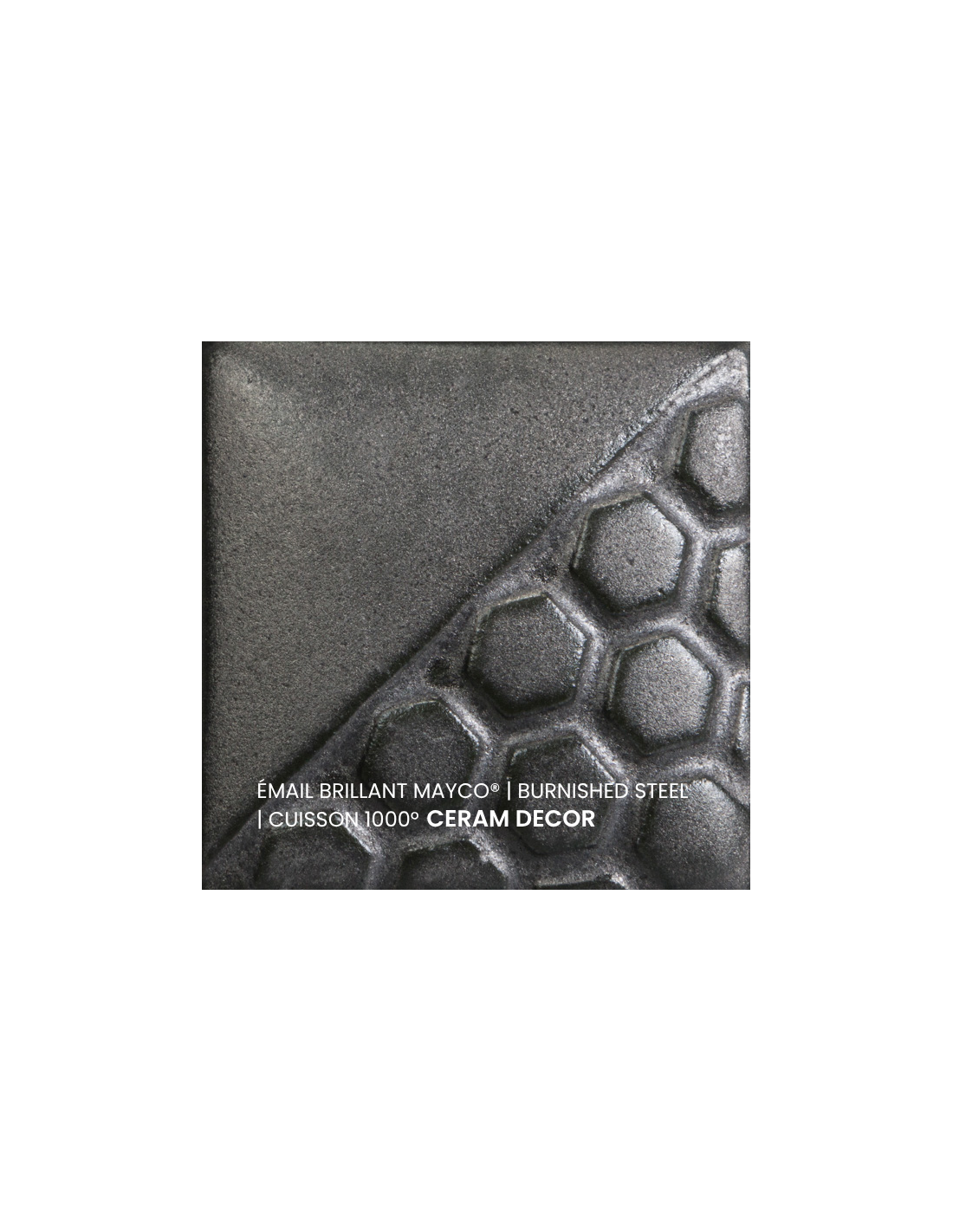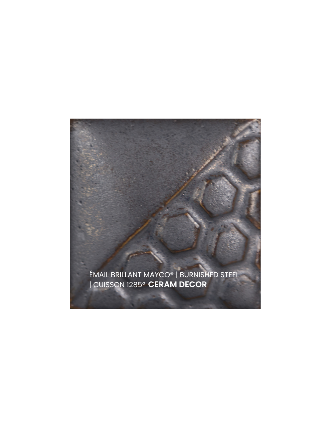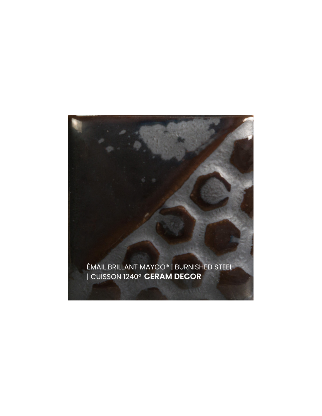 L'émail brillant burnished steel Mayco® est non toxique, pardonne tout et a un temps de séchage rapide et stable, tout en donnant à votre pièce une brillance éclatante ! Il améliore également les couleurs sous glaçure, est résistant à l'engouement et, surtout, est très facile à utiliser. Sa composition et son mode de fabrication lui assure un excellent nappage lors de la cuisson qui corrige éventuellement les défauts d'application. Il est très flexible et simple d'emploi.