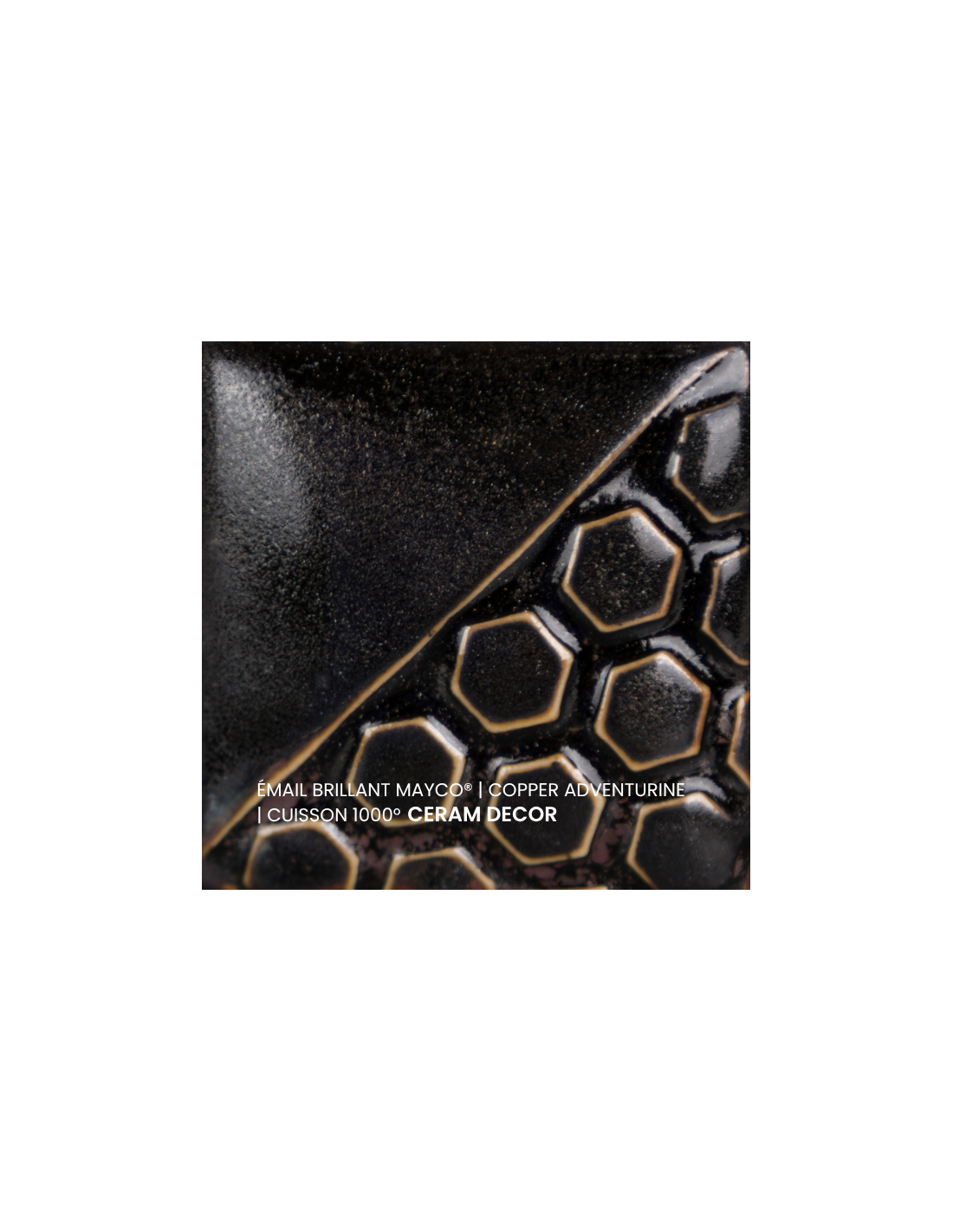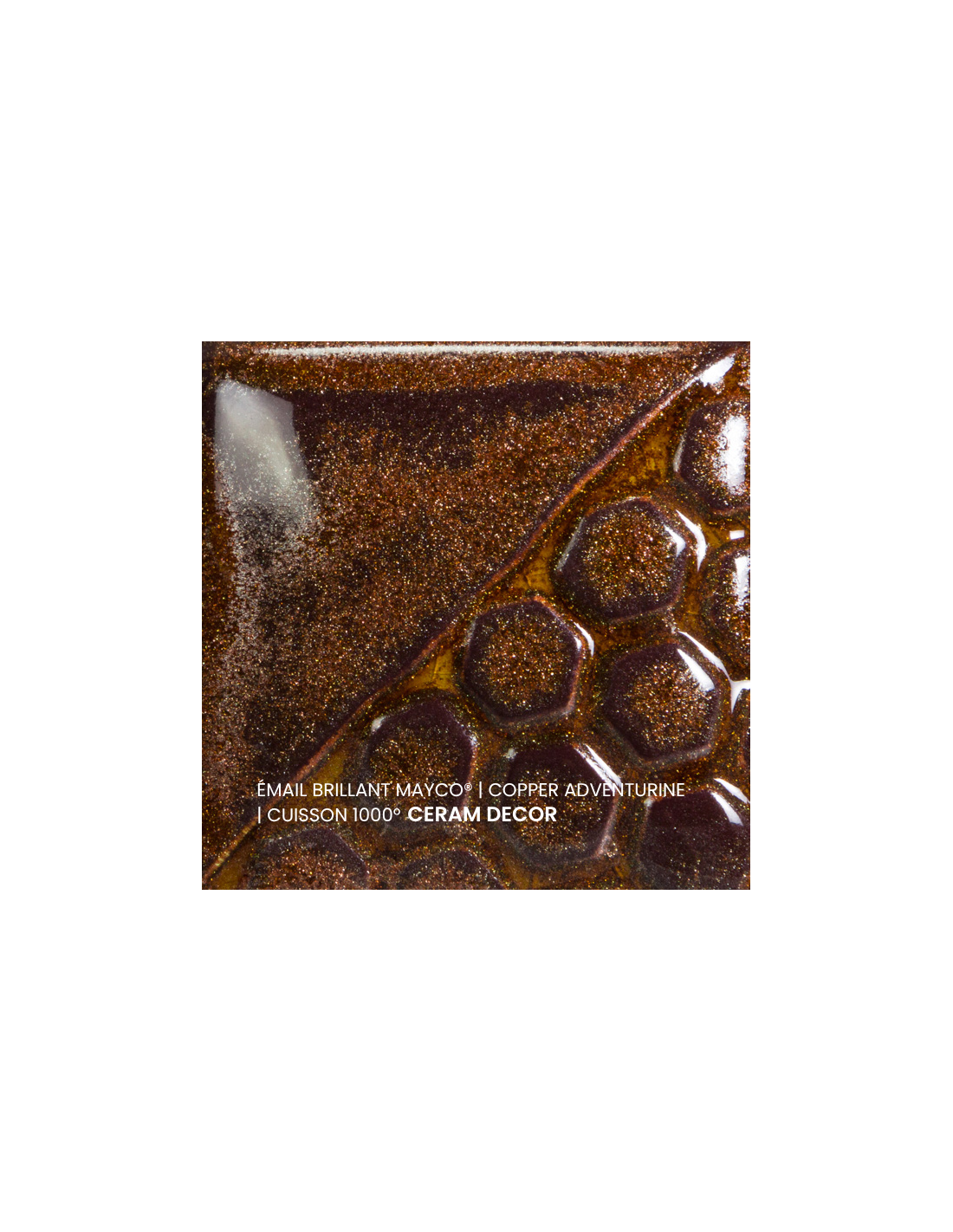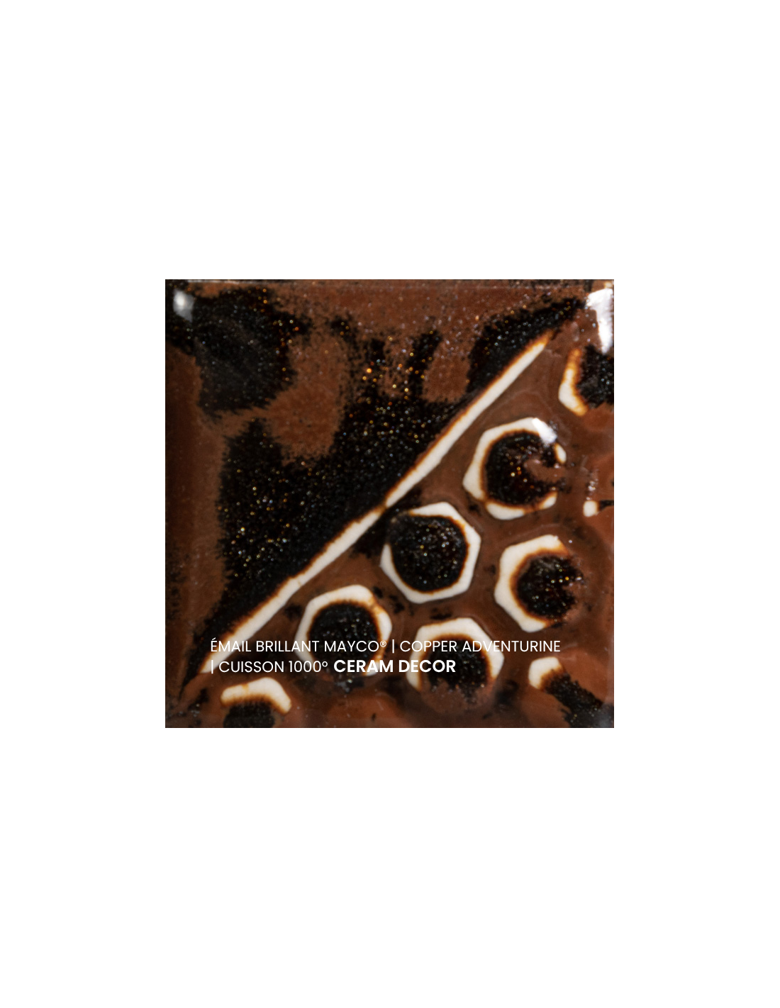 L'émail brillant copper adventurine Mayco® est non toxique, pardonne tout et a un temps de séchage rapide et stable, tout en donnant à votre pièce une brillance éclatante ! Il améliore également les couleurs sous glaçure, est résistant à l'engouement et, surtout, est très facile à utiliser. Sa composition et son mode de fabrication lui assure un excellent nappage lors de la cuisson qui corrige éventuellement les défauts d'application. Il est très flexible et simple d'emploi.