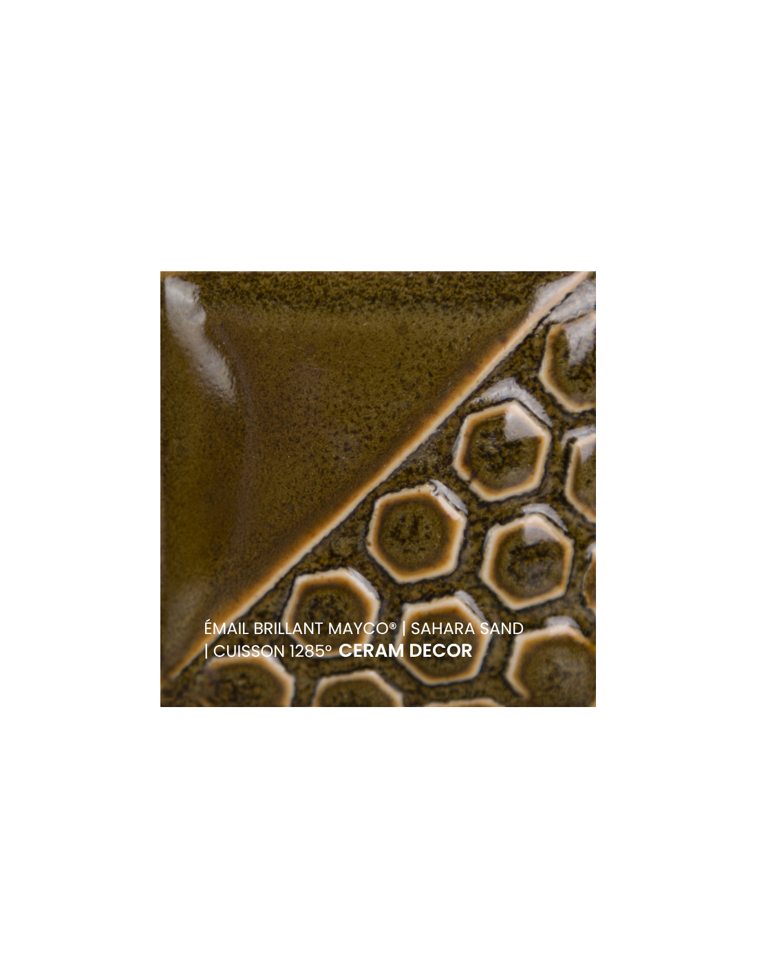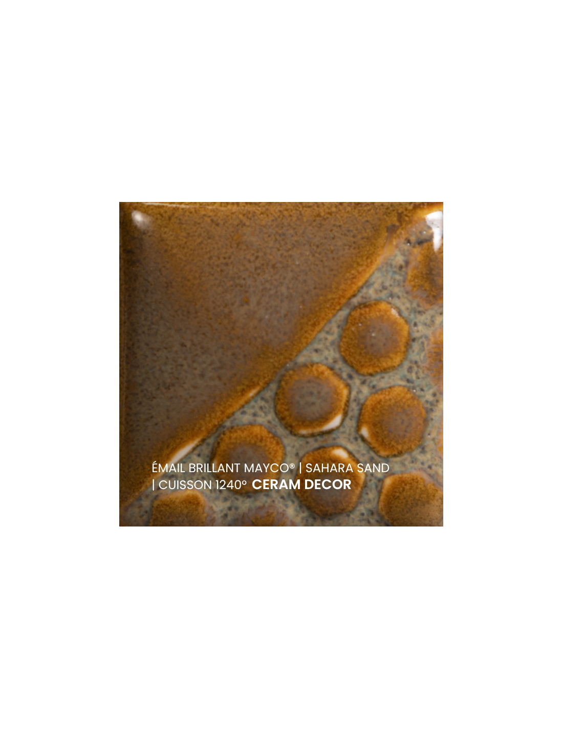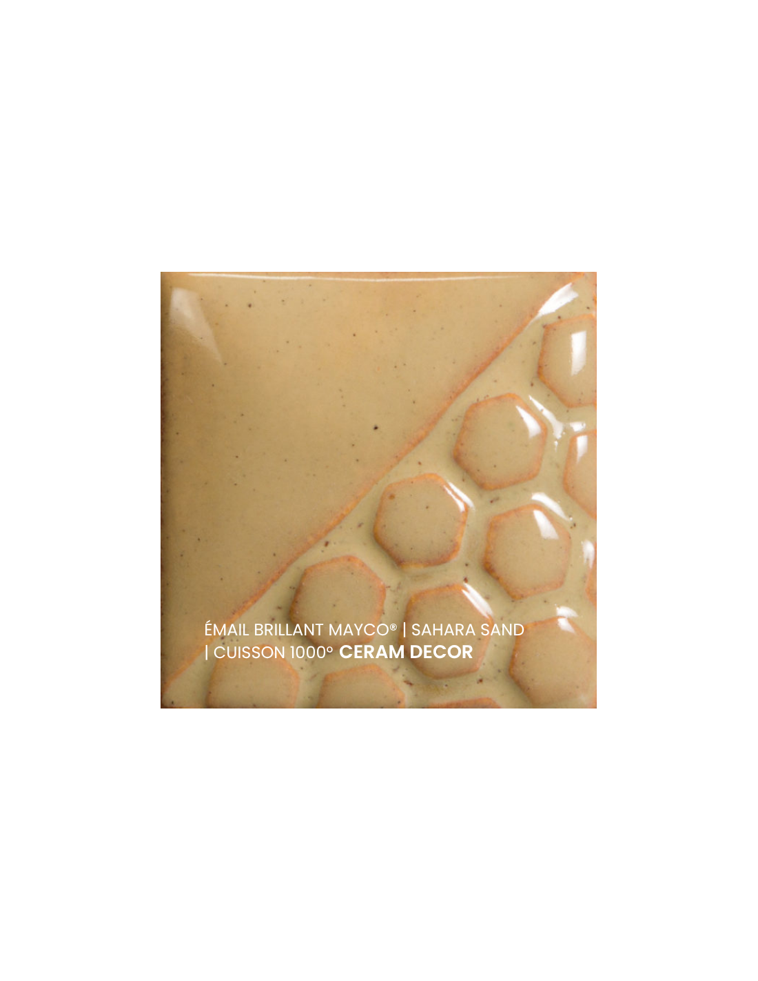 L'émail brillant sahara sand Mayco® est non toxique, pardonne tout et a un temps de séchage rapide et stable, tout en donnant à votre pièce une brillance éclatante ! Il améliore également les couleurs sous glaçure, est résistant à l'engouement et, surtout, est très facile à utiliser. Sa composition et son mode de fabrication lui assure un excellent nappage lors de la cuisson qui corrige éventuellement les défauts d'application. Il est très flexible et simple d'emploi.