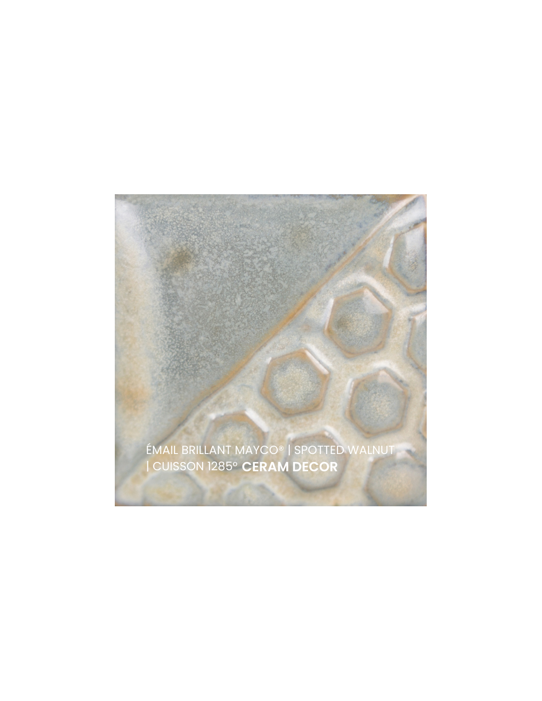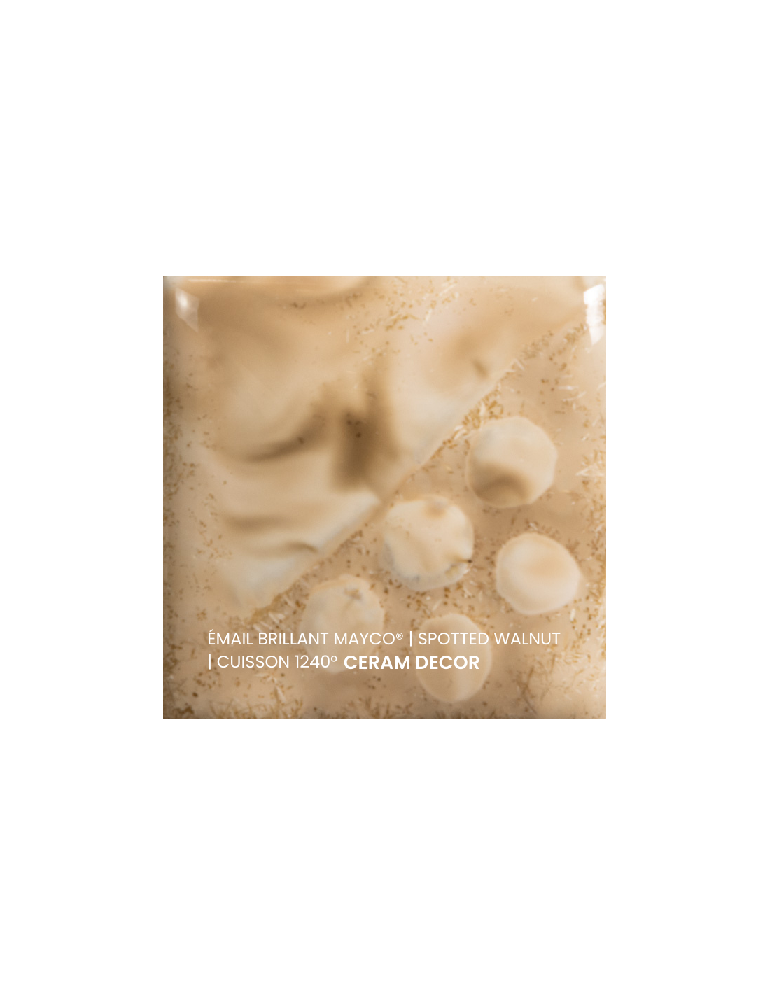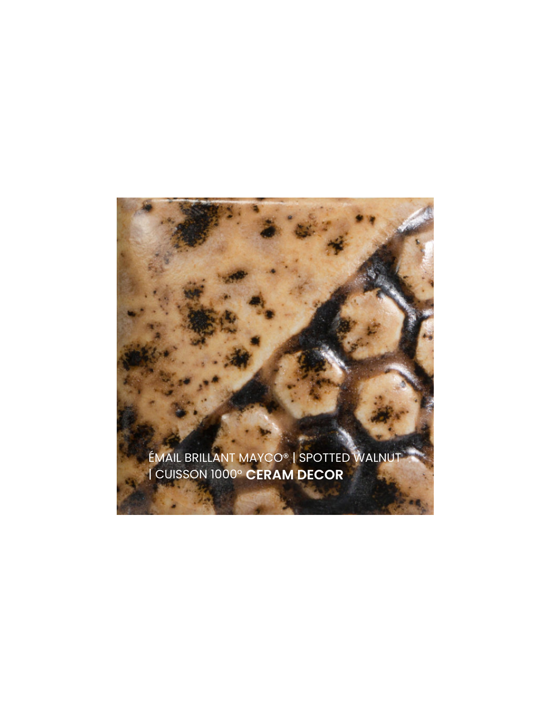 L'émail brillant spotted walnut Mayco® est non toxique, pardonne tout et a un temps de séchage rapide et stable, tout en donnant à votre pièce une brillance éclatante ! Il améliore également les couleurs sous glaçure, est résistant à l'engouement et, surtout, est très facile à utiliser. Sa composition et son mode de fabrication lui assure un excellent nappage lors de la cuisson qui corrige éventuellement les défauts d'application. Il est très flexible et simple d'emploi.