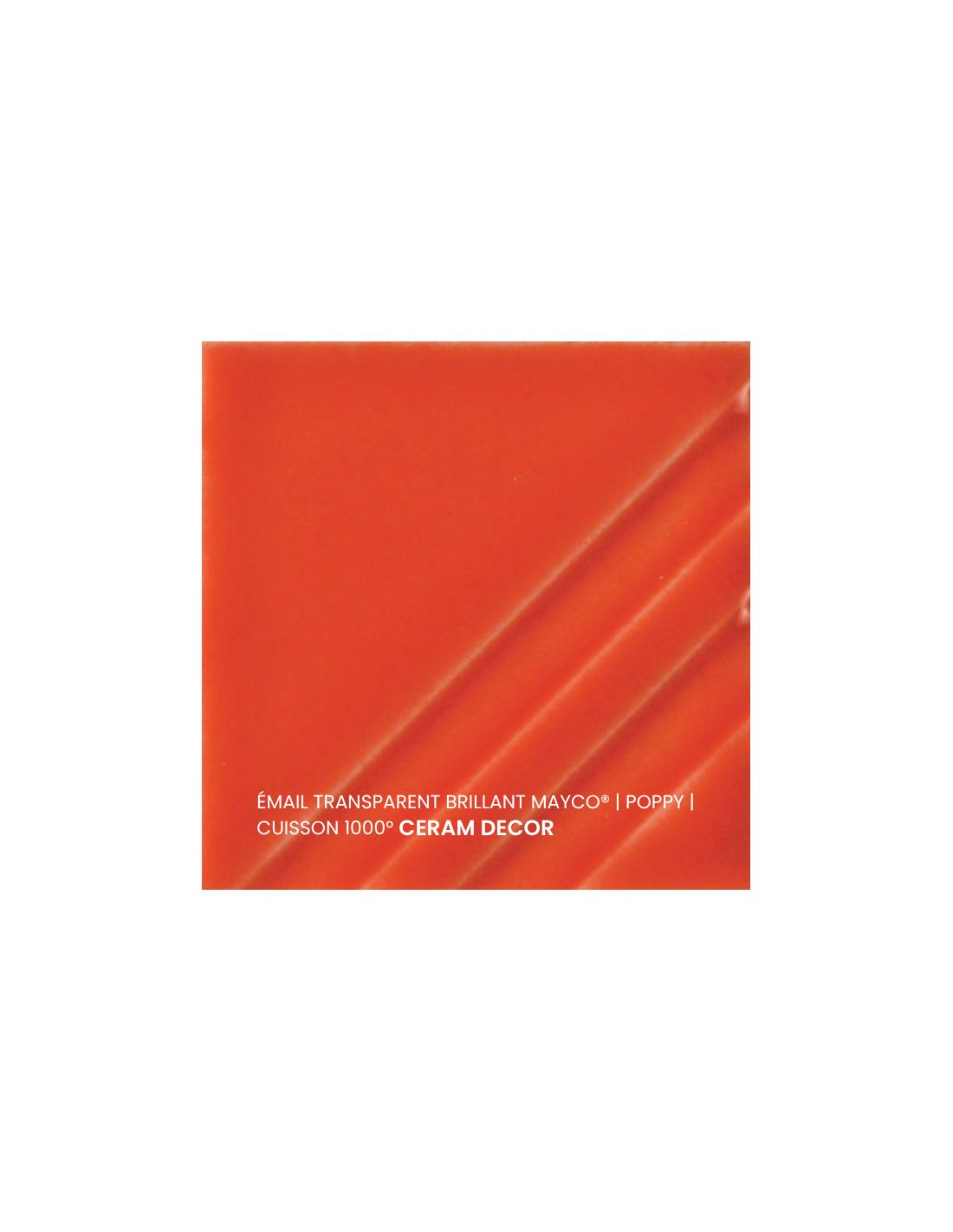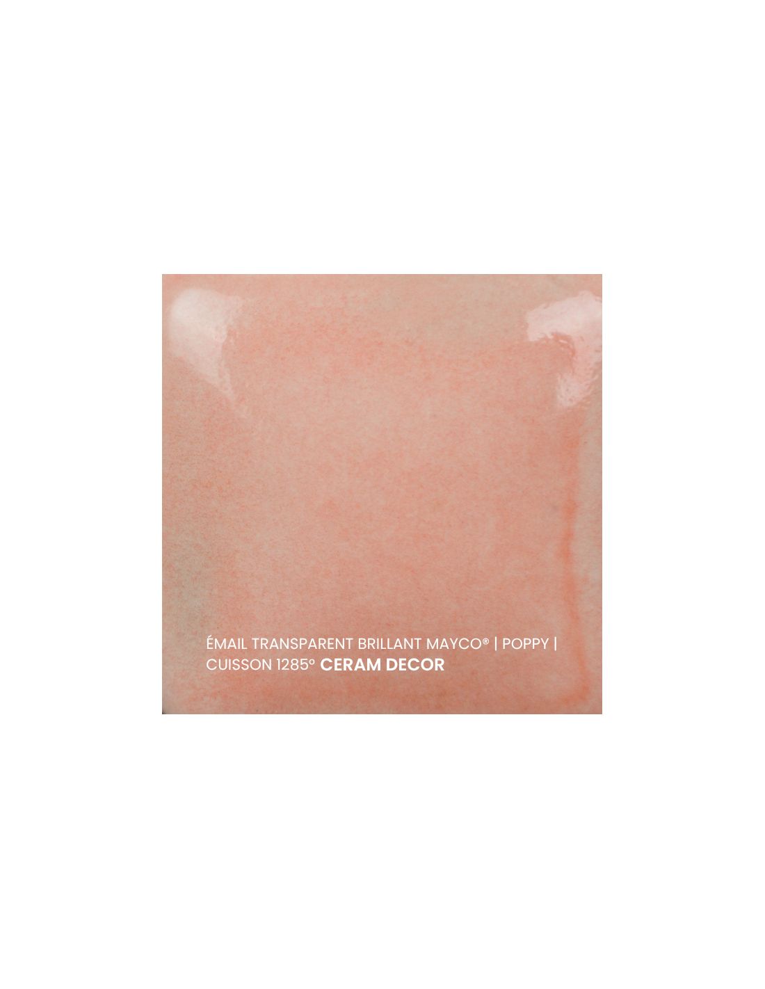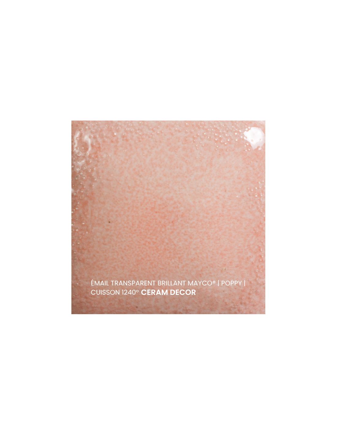 L'émail transparent brillant poppy Mayco® est non toxique, pardonne tout et a un temps de séchage rapide et stable, tout en donnant à votre pièce une brillance éclatante ! Il améliore également les couleurs sous glaçure, est résistant à l'engouement et, surtout, est très facile à utiliser. Sa composition et son mode de fabrication lui assure un excellent nappage lors de la cuisson qui corrige éventuellement les défauts d'application. Il est très flexible et simple d'emploi. Toutefois, il peut donner un reflet bleuté sur certaines terre rouges.
