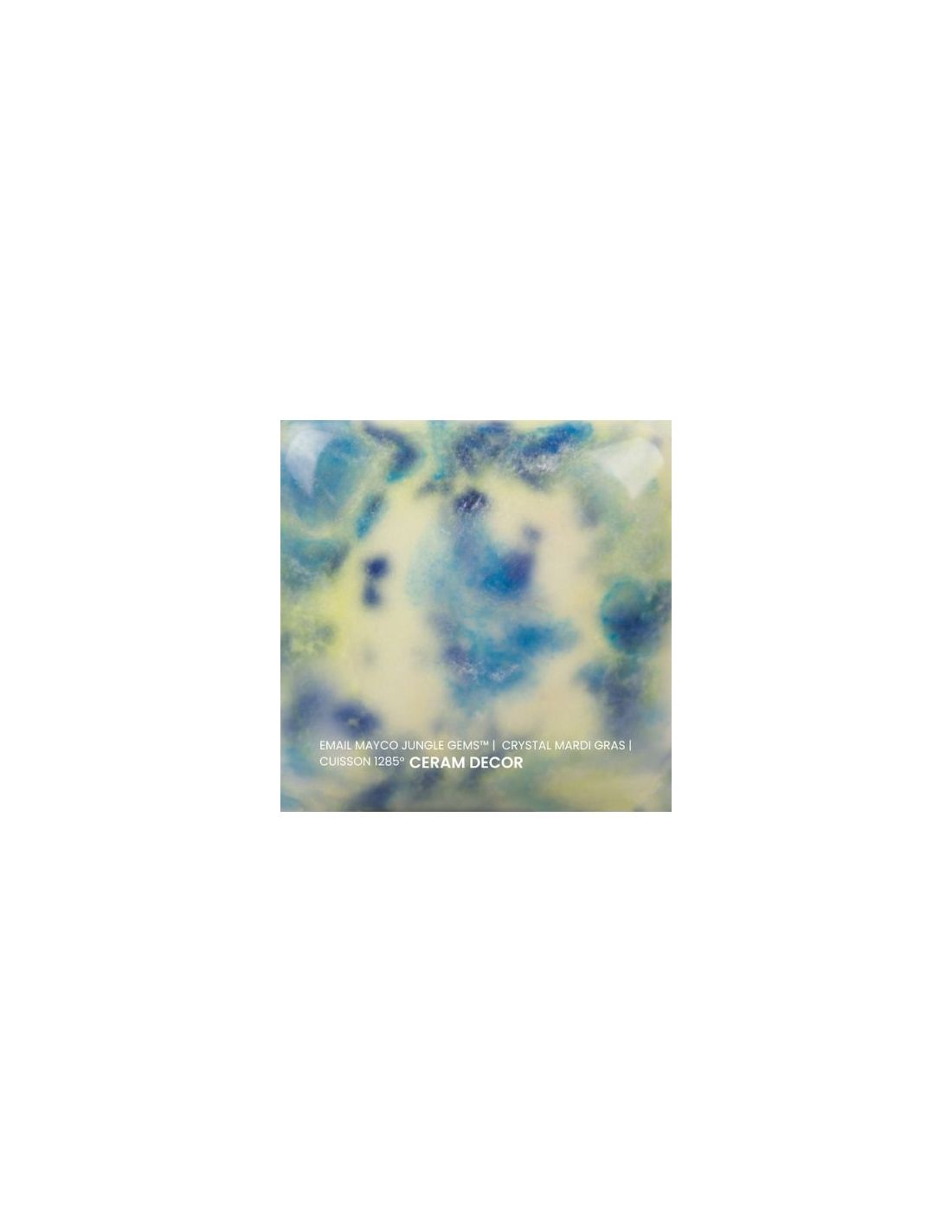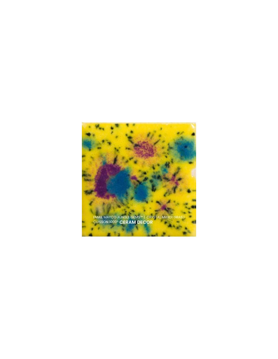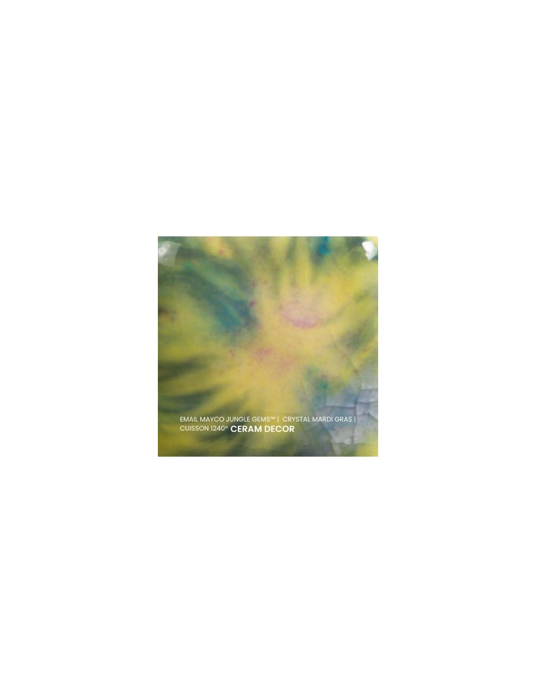 L'émail mardi gras de la série "Jungle Gems" Mayco® se compose d'une couleur de fond et de cristaux brillants colorés. Il est non toxique, possède un temps de séchage rapide et stable, tout en donnant à votre pièce un résultat étonnant! Sa composition et son mode de fabrication lui assure un excellent nappage lors de la cuisson qui corrige éventuellement les défauts d'application. Il est très flexible et simple d'emploi. Chaque émaillage est différent, les cristaux s'étalent sur les pièces plates et coulent sur les pièces verticales. Ils peuvent être superposés ou mélangés pour donner des effets spéciaux.