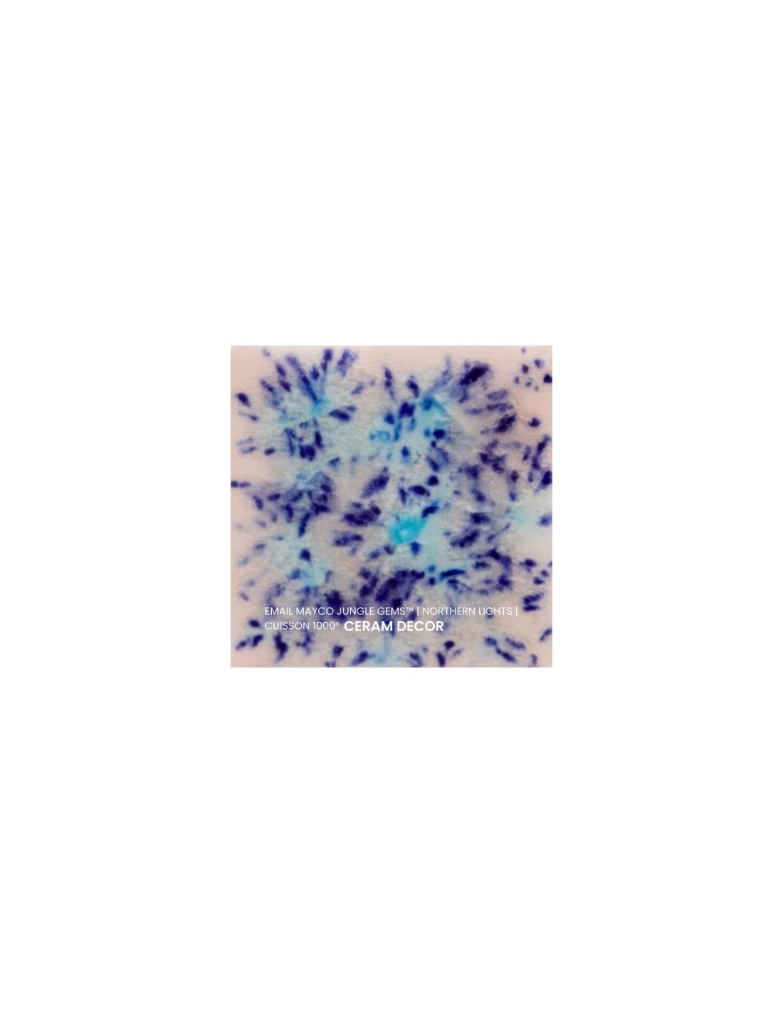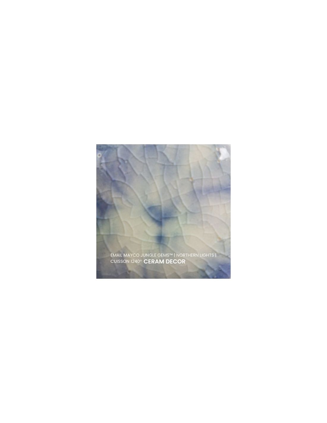 L'émail northern lights de la série "Jungle Gems" Mayco® se compose d'une couleur de fond et de cristaux brillants colorés. Il est non toxique, possède un temps de séchage rapide et stable, tout en donnant à votre pièce un résultat étonnant! Sa composition et son mode de fabrication lui assure un excellent nappage lors de la cuisson qui corrige éventuellement les défauts d'application. Il est très flexible et simple d'emploi. Chaque émaillage est différent, les cristaux s'étalent sur les pièces plates et coulent sur les pièces verticales. Ils peuvent être superposés ou mélangés pour donner des effets spéciaux.