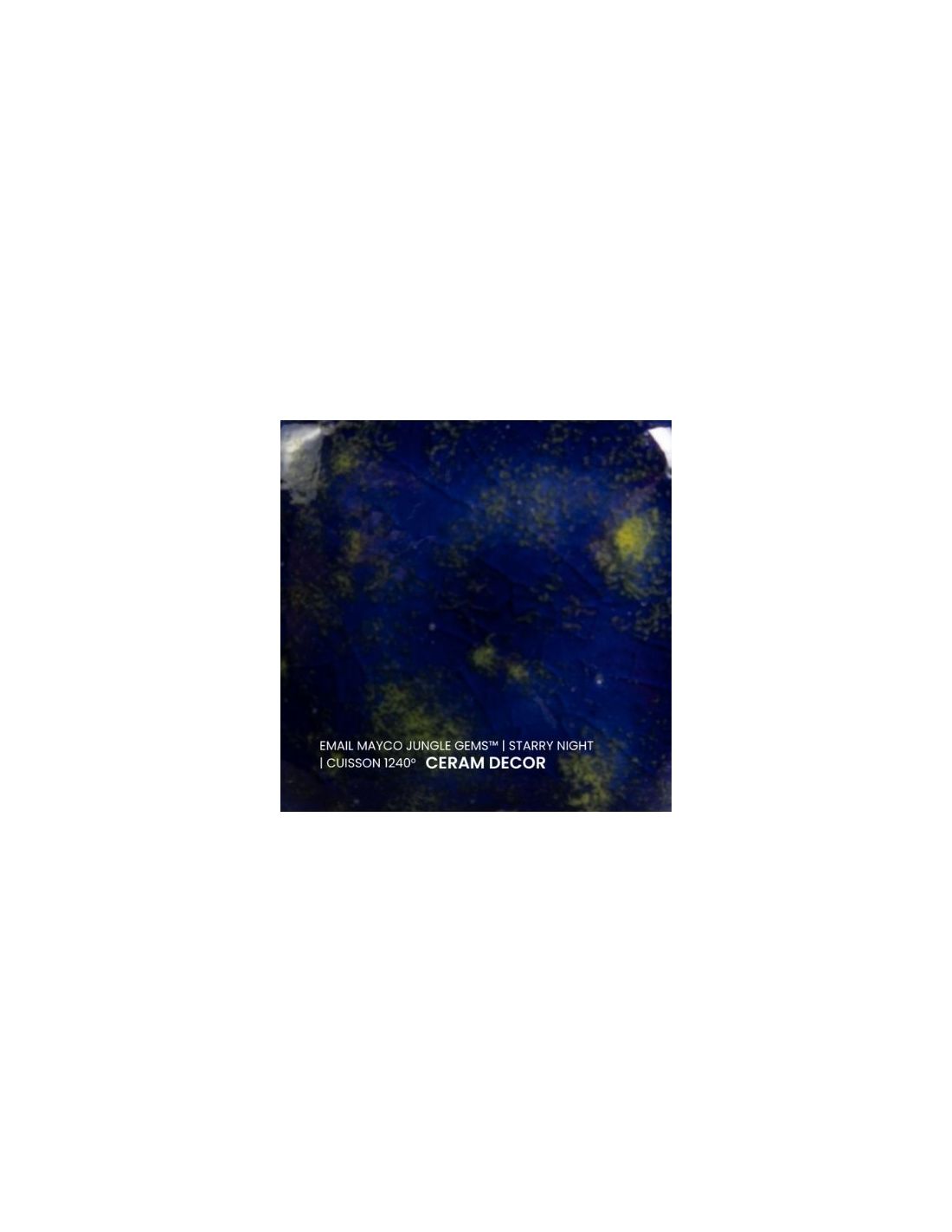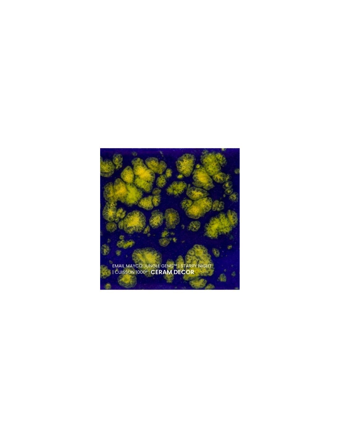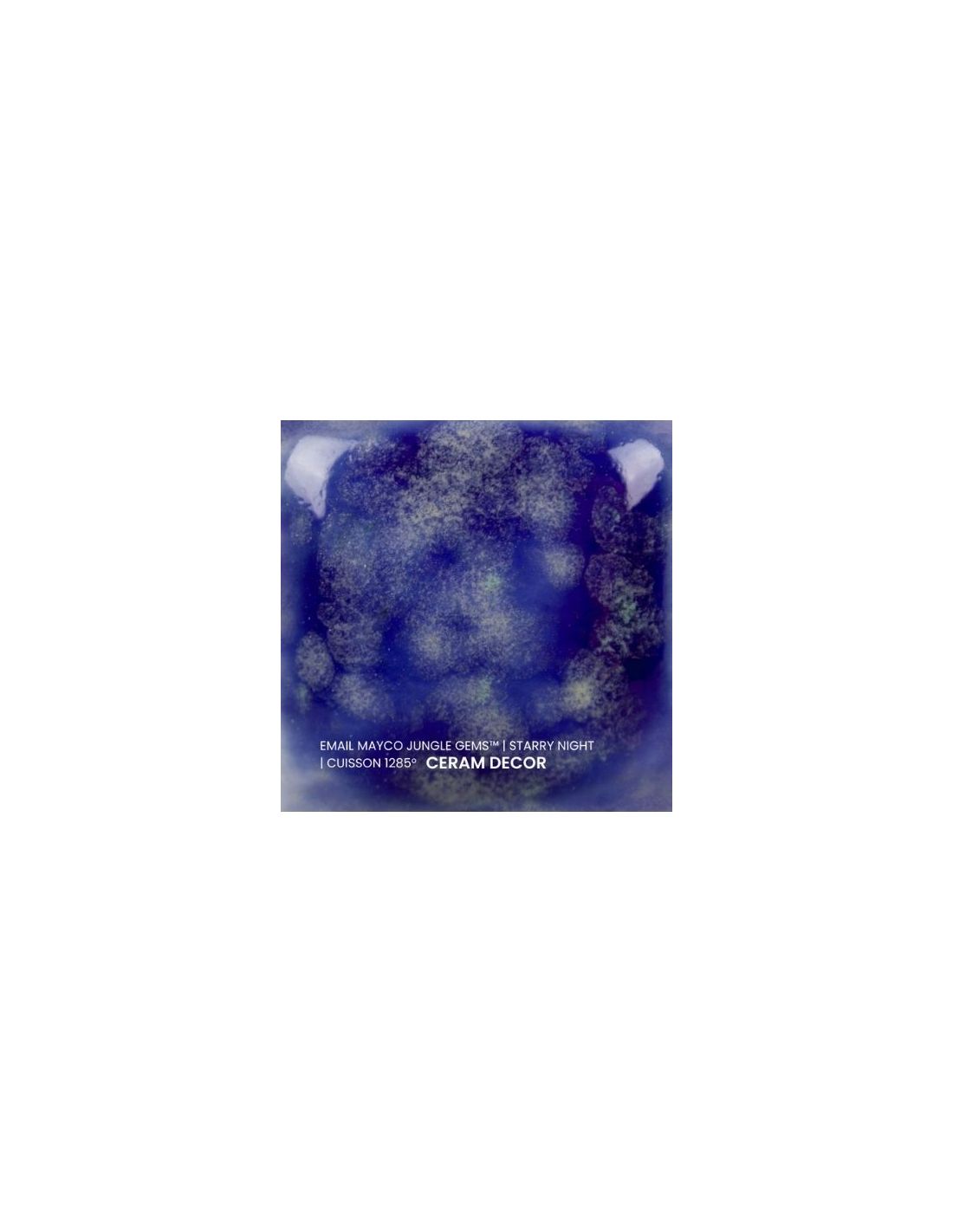 L'émail starry night de la série "Jungle Gems" Mayco® se compose d'une couleur de fond et de cristaux brillants colorés. Il est non toxique, possède un temps de séchage rapide et stable, tout en donnant à votre pièce un résultat étonnant! Sa composition et son mode de fabrication lui assure un excellent nappage lors de la cuisson qui corrige éventuellement les défauts d'application. Il est très flexible et simple d'emploi. Chaque émaillage est différent, les cristaux s'étalent sur les pièces plates et coulent sur les pièces verticales. Ils peuvent être superposés ou mélangés pour donner des effets spéciaux.