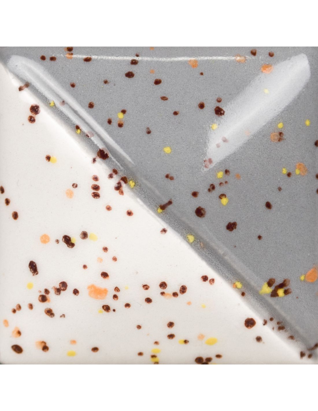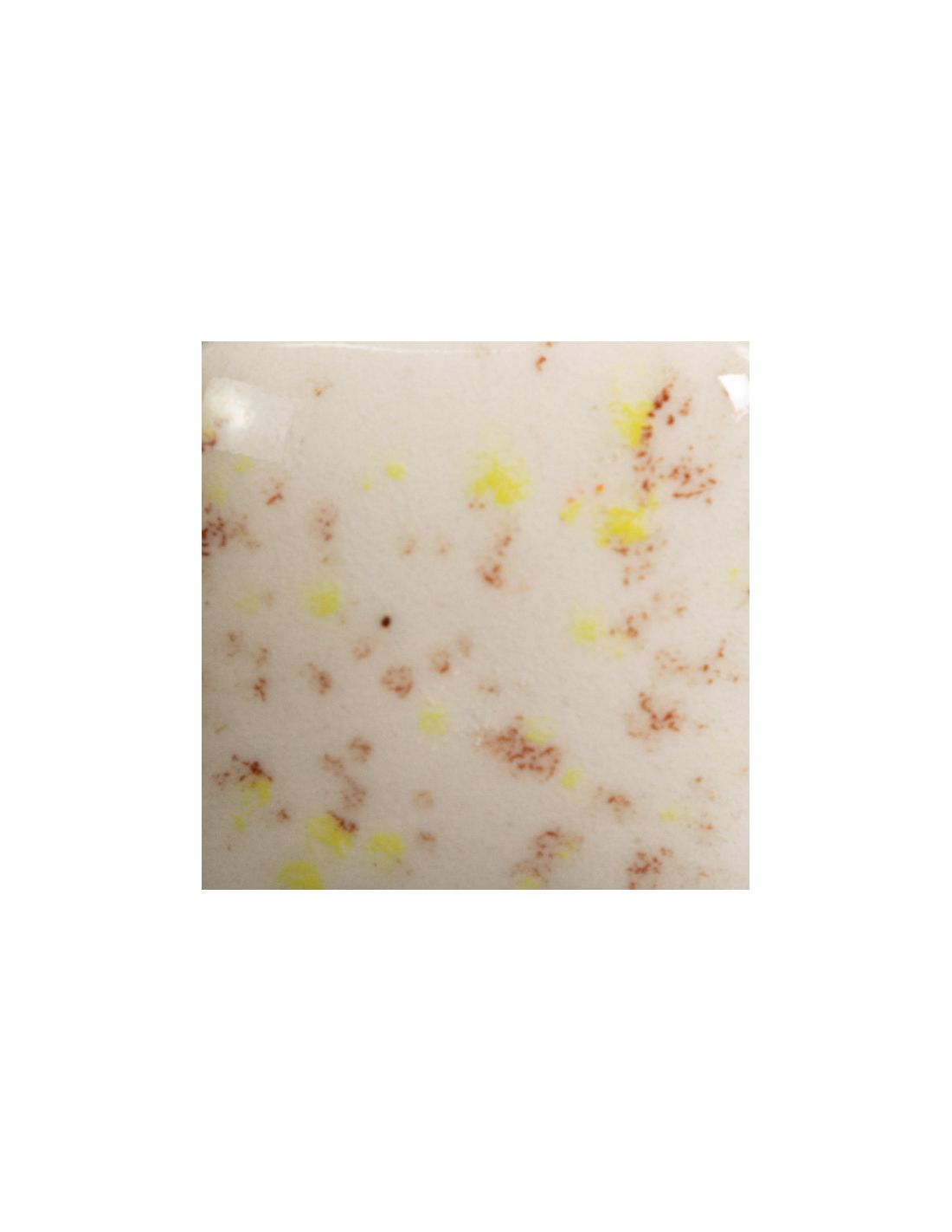 En cuisson à cône 06 ( la première ), le rendu est brillant transparent avec des tâches colorées oranges, jaunes et brunes qui changeront d'apparence avec différentes couvertes